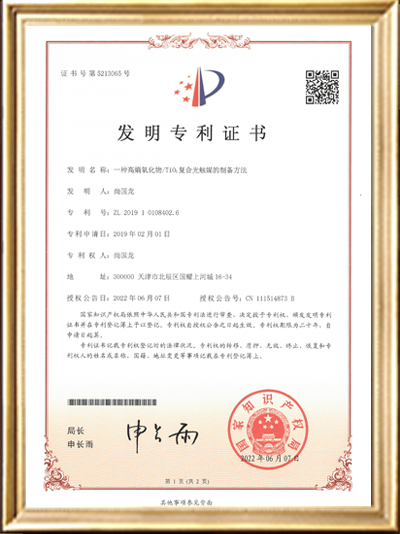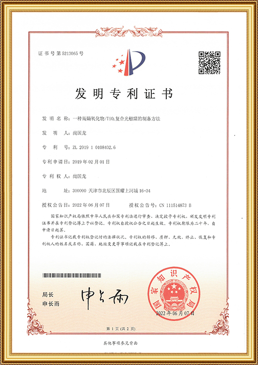 • 發(fā)明專利證書證書(一種高稿氧化物/Ti02復合光觸